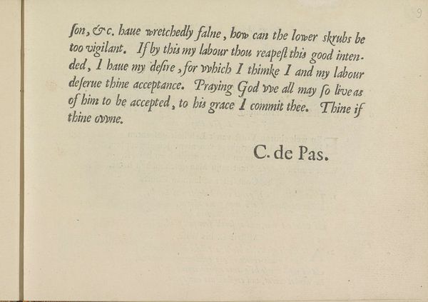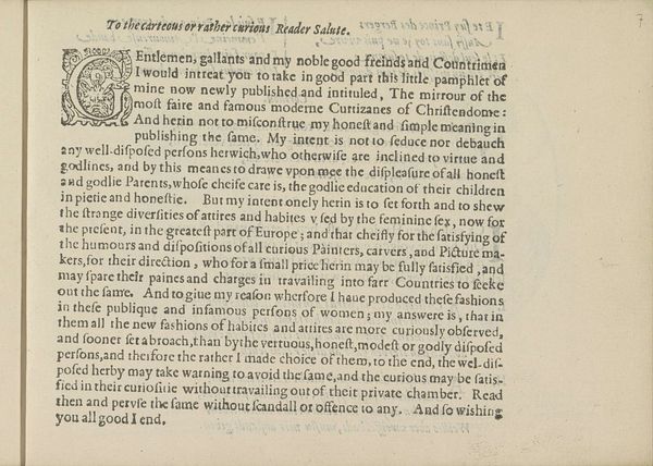 Curator: This intriguing piece, currently housed in the Rijksmuseum, is titled "Nederlandstalig voorwoord, pagina 2," which translates to "Dutch Preface, Page 2." It's an engraving, a printed work on paper crafted around 1641 by Crispijn van de Passe the Younger. The typography alone creates a visual experience, and that’s before considering the textual content. Editor: Immediately, I'm struck by the texture and the aged feel of the paper itself. There’s something inherently intimate about seeing handwritten, or rather, hand-lettered text. It’s also incredibly haunting. The thick font somehow underscores a sense of gravity. What's your take? Curator: The use of this bold font and the specific letterforms certainly draws our attention. It speaks to a period where typography was considered a significant art form in its own right. Lettering styles held meaning, acting almost as emblems. It's as if the very shape of the letters wants to convey the character of the text. The hand-lettering here adds a human quality often lost with movable type. Editor: Absolutely. This page offers more than just religious and moral declarations from its time. It’s very clearly focused on the shortcomings of women. Looking closely at some of the phrases here: "lichte Vrouwen"—"unchaste women", perhaps. There's an immediate connection to discussions about sin, gender, and redemption. Curator: True, such judgements might be considered as artifacts from the time it was composed. The symbolic structure uses these familiar narratives—the fall of David, Samson, and Absalom—as cautions, linking their downfall to female temptation. These stories weren't chosen randomly. Editor: Exactly! In my eyes it underlines the socio-political and cultural anxieties concerning female behaviour during the Dutch Golden Age. The last line "ren tot haer zielen zaligheyd" serves as a heavy conclusion. So much pressure from the Patriarchy. It shows that these visual motifs were crucial in upholding moral boundaries and enforcing social roles. Curator: I agree with your analysis of the role the artwork played in shaping societal behavior at that moment in history. Looking closely and taking some time really opens your eyes! Editor: It definitely invites an engaging intersection between historical context and how artworks functioned to reflect and shape norms of their day. That will stick with me!