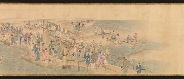 Curator: This delicate book, open to a double-page spread, showcases Katsushika Hokusai's "Stations- Hokusai's Album of Travel Pictures" from around 1830. It's a woodblock print with ink, now residing at the Minneapolis Institute of Art. What are your immediate thoughts? Editor: The scenes convey a sense of movement and intimacy; the figures crammed into the boats create an immersive composition that invites observation. The peach colored background is an amazing complement to the blue tones in the water! Curator: I find it interesting that the work comes from an album, suggesting a private or portable experience. Hokusai’s prints and books reached a broad audience but these travel sketches almost feel like notes that could have informed some of the artist's larger productions. We know ukiyo-e prints helped create a sense of shared cultural identity in Japan. Do you see any of that here? Editor: Definitely. There's an intriguing narrative thread running through both scenes; it feels like encountering archetypes in travel rather than individuals. Look at the figure in the first panel aiming the stick toward a bird. Or, is he? What is he hunting? We see that shape used often in spiritual ceremonies to cast out evil and invoke luck. Perhaps both interpretations are correct, and maybe neither! It is the in-between state, I suspect, that gives this work its unique presence. Curator: I agree; it is complex. It’s easy to appreciate Hokusai’s draftsmanship, yet you've highlighted an interesting symbolic layer – the suggestion of spiritual undertones intertwined with the depiction of daily life and labor, and those wonderful pink colors. These touches must have resonated deeply. Editor: Precisely! And consider how even seemingly minor components such as mountains, the shore and boats all acquire significance in an imaginative setting. What else do you observe, perhaps regarding the cultural milieu or audience of this album? Curator: Looking at this, I appreciate how Hokusai manages to give these anonymous figures a sense of vitality and purpose as they work their way through landscape. The album form itself would have contributed to the intimate accessibility, furthering the democratic nature of art distribution at that moment. Editor: It's amazing how such seemingly simple lines can speak to broader experiences and evoke such powerful cultural symbols. I hadn't considered this album as an act of art distribution itself, but now, I must rethink that premise in terms of impact and context!