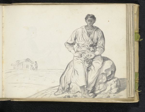Esaias Boursse's delicate pencil drawing presents two figures in a study of form and contrast. The seated man, swathed in drapery, faces away, his back a study in soft curves and gentle shading. In contrast, the standing figure is more starkly defined, his torso rendered with lines suggesting sinew and bone. The composition balances these two forms, with the seated figure's solid mass anchoring the left, and the standing man, framed by the negative space around him, commanding attention on the right. The horizon line, smudged and indistinct, suggests depth without fully committing to it, leaving us in a liminal space. Boursse seems interested in the play of light and shadow across the human form, using subtle gradations to model volume and texture. The stark contrast between the figures destabilizes established meanings and invites ongoing interpretations.