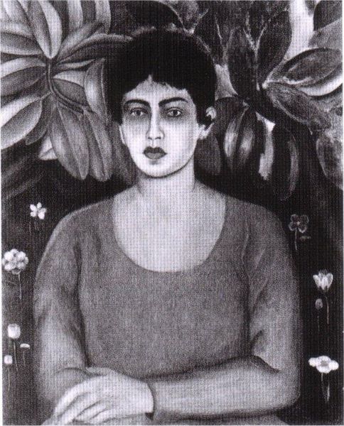 Curator: This is Frida Kahlo's Self-Portrait from 1930. What strikes you first about it? Editor: The intensity of her gaze, coupled with the simplicity of the composition. She’s not trying to impress, she’s simply presenting herself. The vibrant blue of her dress and the striking earrings draw the eye immediately to her face. Curator: Indeed. Kahlo often used self-portraits to explore her identity and emotional state. The unibrow, a prominent feature, is a deliberate choice, rejecting conventional beauty standards and asserting a powerful, almost defiant, self-acceptance. Editor: It’s interesting how she frames herself against the plain, almost austere background, with just the suggestion of a chair. This personal presentation, without external narrative, feels so modern and invites us to project our own interpretations onto her. Curator: Precisely. It’s a powerful act of self-representation, and these personal symbols, like the earrings, carry so much weight in conveying her inner world. Editor: A remarkable testament to her enduring legacy.