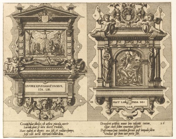 Curator: Oh, how heavy it feels to look at this! Almost like staring directly into a past life... melancholic but grand, no? Editor: I'm struck by the precision, and sheer labour involved in creating this. Hans Vredeman de Vries, "Cœnotaphiorum (22)," an engraving from 1563. Note the inscription and the intricate architectural detail on the monuments, they both feel very precisely planned in relation to their overall construction as devotional objects. Curator: Monuments to ideas, more like. See how each little cherub or stoic guardian seems lost in thought? The detail isn't just ornamentation; it's all tiny dramas, almost gothic miniatures in themselves. Like each character carries a little story or symbolic burden of history. Editor: I'm also very drawn to the context—prints at this time were about accessibility. Consider the socio-economic implication of Vredeman de Vries making grand architectural designs available for a wider audience, enabling knowledge sharing of not just design but classical ideals? Curator: Absolutely, these are architectural fantasies available in mass! Although there is an inescapable sense of…distance. Maybe it is from that clean style, but also those Latin epitaphs reminding me of impermanence, so that it could also serve as the "Memento Mori." Even a perfect cenotaph only commemorates that something is absent. Editor: But that accessibility challenges hierarchies. Was Vredeman de Vries simply crafting images, or distributing tools that shape how the aspirational classes can see and, very crucially, re-make their surroundings? It questions what making and influence looked like then. Curator: A crucial distinction—perhaps why this work, despite being centuries old, resonates so strongly. A constant cycle of wanting, achieving, remembering that always comes to naught—it feels oddly modern. Editor: Thinking about it, seeing the print's production this way brings fresh considerations on artistic purpose.