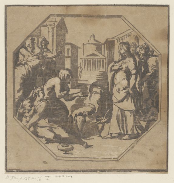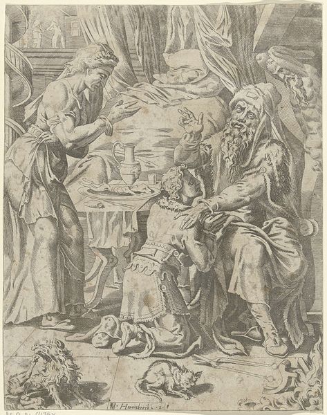 Sebald Beham rendered Susanna and the Elders in ink with white heightening on blue paper in the 16th century. The composition centers around the pale figure of Susanna, framed dramatically by the darker, looming figures of the elders. The artist plays with the tension between light and shadow to emphasize Susanna's vulnerability. Beham’s work here delves into the underlying power structures of perception and representation. Susanna's nudity, rendered with delicate lines, becomes a focal point within a narrative of voyeurism and male dominance. The elders, shrouded in heavy robes, symbolize the oppressive gaze and authority. This dynamic challenges the viewer to consider how the act of looking can be an exercise of power. Note the strategic use of line and form to amplify the psychological weight of the scene. It encourages ongoing interpretation about the dynamics of power, desire, and moral judgment.