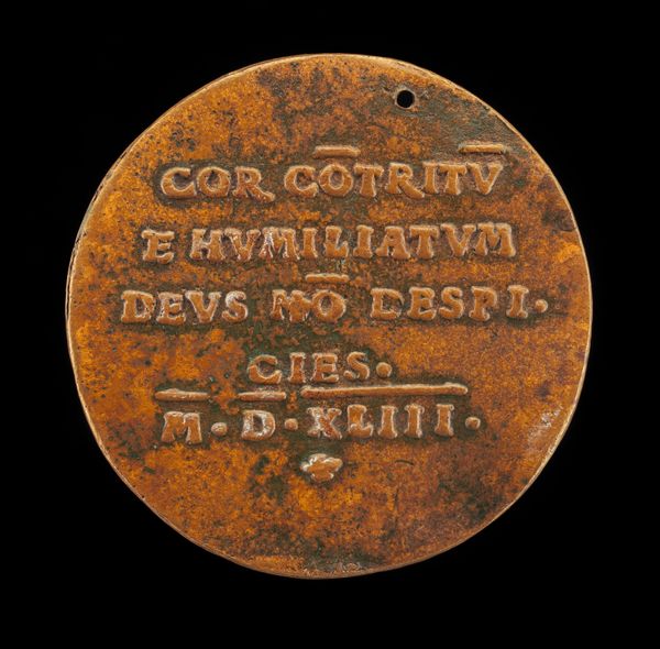 Editor: This is Friedrich Hagenauer’s bronze medal from 1543, titled “Inscription [reverse]”. It’s a small, circular piece with text inscribed in what looks like Latin. The texture and the color give it a very antique feel. How would you interpret this piece? Curator: Well, consider the moment in which this object was created: the Reformation was reshaping Europe, challenging established religious and political orders. Hagenauer, working in Augsburg, a city at the crossroads of these movements, crafted this medal as a potential act of resistance. Editor: Resistance? How so? Curator: The inscription referencing Psalm 36: "Trust in God and pray to him," could be viewed as a subtle endorsement of personal piety during a time when religious authority was intensely debated. The medal itself would be touched and handled. Editor: So, this medal becomes a pocket-sized manifesto? Curator: Precisely. And we need to also think about who was commissioning and possessing these objects. Who would benefit from the quiet reminder of faith represented by this inscription? Was it personal adornment, or did its wear have social implications within a contested Augsburg? Editor: I hadn’t thought about it that way. So much more than just a decorative object! Curator: Exactly. Hagenauer’s work exemplifies how art can serve as a silent, yet powerful form of expression and negotiation within historical power structures. These objects are traces, they speak of those who may otherwise remain voiceless. Editor: I’m starting to see how deeply intertwined art is with the social and political landscape of the time. Thank you. Curator: Of course, reflecting on that dynamic always opens new avenues for understanding.