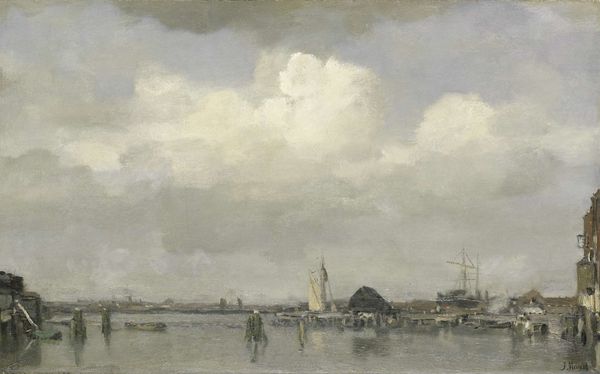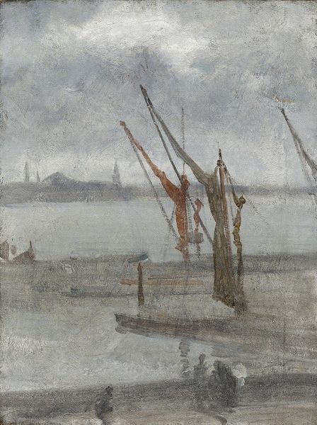Curator: Good morning. We’re looking at "The Grey Lagoon," an oil painting by Francesco Guardi, created around 1765. Editor: It's incredibly subdued, isn't it? A symphony in grey. The tonality evokes a sense of melancholic stillness, like time suspended over the water. Curator: Guardi painted Venice during a period of economic and political decline, reflecting in many ways the fading grandeur of the Venetian Republic. Editor: The atmospheric perspective really contributes. Notice how the distant city fades almost imperceptibly into the sky, reinforcing that feeling of ethereal detachment. It is a masterclass in suggesting depth through tone. Curator: Absolutely. Venice became an essential stop for aristocratic travelers during the Grand Tour. Guardi capitalized on this market, producing numerous views for foreign visitors eager to take home a souvenir of their travels. Editor: The composition, though simple, is incredibly effective. The low horizon line emphasizes the vastness of the lagoon, almost overwhelming the small boats. What do you make of the gondola taking up the most space in the foreground? Curator: I believe its prominence suggests that these iconic boats have always been associated with Venetian life. Their image as traditional fixtures made Venice even more appealing to tourists seeking the exoticism of Italian culture. Editor: You’re right; even the brushstrokes are fascinating here. Quick, almost impressionistic dabs of paint suggesting movement, despite the overall stillness. Curator: And the choice of oil on canvas speaks to the artistic conventions of the era. Guardi was part of a thriving art market that catered to the tastes and desires of wealthy patrons. Editor: For me, "The Grey Lagoon" is a meditation on impermanence. Venice, a beautiful dream slowly dissolving into the sea. Curator: Indeed. Viewing Guardi’s piece within its historical context reminds us how much art production intertwines with Venice’s social and economic changes. Editor: A sobering thought and beautifully illustrated in this work. Curator: Precisely; Guardi's commercial insight provides a complex portrayal of Venetian identity at a period of cultural shift.