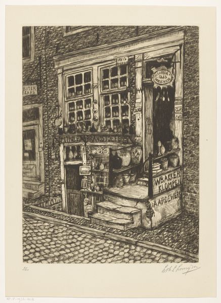 Curator: Armand Collard’s “Oude gevel met poort,” or "Old Facade with Gate," created in 1888, presents us with a remarkably detailed scene rendered through etching and printmaking techniques. Editor: It immediately evokes a sense of aged dignity and perhaps a touch of melancholy. The monochromatic palette combined with the subject matter conjures up historical narratives. Curator: Indeed. Consider the textures achieved here; Collard masterfully depicts weathered wood and stone. It makes one think about the labour invested not just in the art's creation, but the building itself, centuries before. What cultural values might it have represented for its original occupants? Editor: And it’s more than just technical skill; he chooses to focus on these rather mundane buildings. The selection of ordinary rather than obviously glorious things hints at realism’s emphasis on the dignity of the everyday, challenging art historical norms, if even in a minor key. What can such architectural subjects from the Golden Age tell us? Curator: Symbols often hide in plain sight. Buildings such as this represent social memory and preservation. This façade likely witnessed numerous life cycles; consider its visual role in shaping our understanding of belonging and communal heritage. Editor: The question of what has been valued or devalued also seems apparent, since our memory often ignores that which appears simple. These old facades testify the complex labor processes from selecting stone and timber, transporting material, joining them into forms… the effort of an entire era and society, perhaps? Curator: Precisely! This etching, in a way, has become an artifact itself—a reflection on time's passage, and the ways cultural values get materialized in art. Editor: Well, looking closely at the processes and implications of representation lets us rethink the ways we have learned to see art and perhaps the culture. Curator: It certainly enriches our perspective beyond just aesthetics; allowing deeper insights into societal frameworks captured visually. Editor: I find I see beauty more readily when the marks of making and labor come more readily to view.