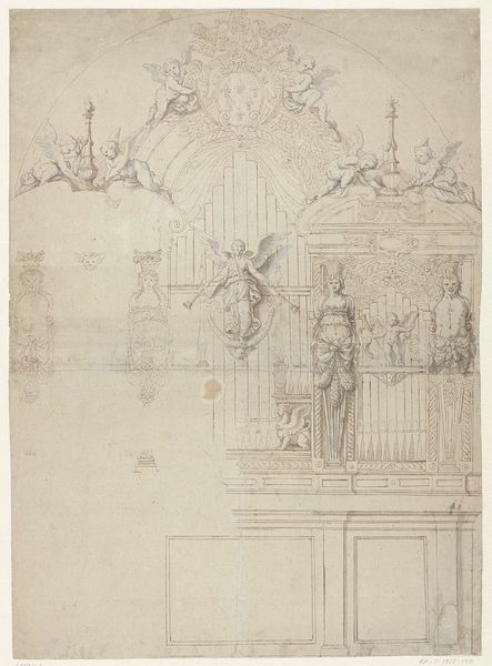 This drawing of a mirror with a cartouche was made anonymously with pen and brown ink on cream laid paper. The delicate lines reveal a design for an ornate mirror, complete with sculptural figures and elaborate ornamentation. Though just a sketch, we can appreciate the skill required to conceive such an intricate object, a luxurious item intended for an aristocratic setting. The design reflects the period's taste for grandeur, but also speaks to the labor involved in its potential production. The carving, gilding, and glasswork would have required skilled artisans, each contributing to the mirror's final form. Consider, too, the social implications of such an object. A mirror like this wasn't just for seeing one's reflection; it was a statement of wealth and status. This drawing reminds us that even seemingly simple objects can be understood as products of complex social and economic relationships.