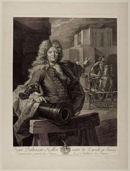 Curator: Let's turn our attention to this striking engraving by Pierre Drevet, depicting François Louis de Bourbon, Prince de Conti. Editor: Oh, the Prince practically shimmers! Look at that pose, so self-assured. It’s like he’s daring us to question his power. Curator: Drevet, born in 1663, was a master of the burin, and the level of detail he achieves here speaks to a deep understanding of the printing process and its relationship to social status. The work exists as both an aesthetic object and a document of power. Editor: You know, I find it strangely intimate despite the grandeur. It is as though he is trying to tell me a story. Curator: Indeed, and that story involves not only the Prince himself but the very means by which his image was disseminated and consumed. Editor: It is quite haunting, I must say. Curator: For sure, the Prince and the engraver managed to capture a fleeting moment in time with such precision.