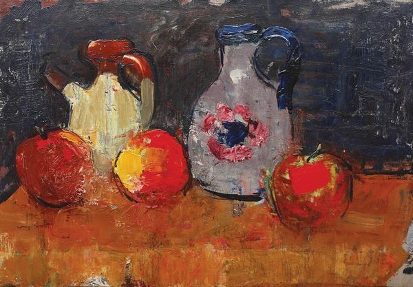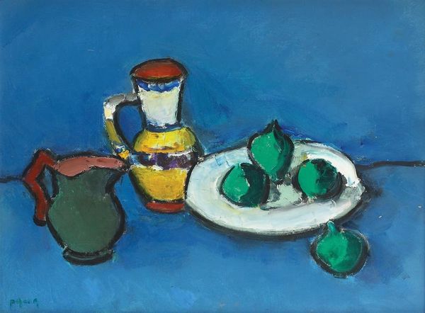 Editor: So this is Émilie Charmy’s "Still Life" from 1904, rendered in oil paint. The vibrant colors give it an almost unsettling energy, contrasting with the traditional subject matter of a still life. How do you interpret this piece? Curator: The dissonance is fascinating, isn’t it? While Charmy engages with the familiar subject of a still life, she does so through the Fauvist lens. This carries a symbolic weight. Still lifes, historically, represent the transient nature of life, “vanitas.” The Fauvist colors, however, inject an almost aggressive vitality, questioning mortality itself. Do you see how the palette shifts the reading? Editor: I do. It feels less about acceptance of death and more about...a rebellion against it? The bold greens and reds seem to fight against fading away. Curator: Precisely. The colors clash but also vibrate together, almost as a psychological projection of internal conflicts. The objects are also distorted. Notice how the curves of the fruit and vegetables echo the Art Nouveau style that preceded Fauvism. They appear sensuous, ripe, perhaps hinting at suppressed desires or societal constraints Charmy might have felt. Editor: That’s not something I had picked up on initially. Now, I’m seeing the arrangement as representing her, or women generally, wrestling with their role in society. Curator: Exactly! It is not just about decorative objects, but something else entirely, don't you think? Editor: Yes! Looking at this painting now, I see more than just fruits on a table. I am glad to have uncovered it all! Curator: Indeed. And isn't it wonderful how the emotional language of color can completely transform an artwork’s story?