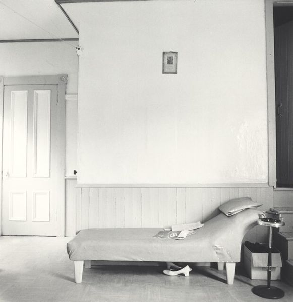 Artist: This is "Eleanor, Chicago," a gelatin silver print from 1948 by Harry Callahan. Gosh, it's like peering into a memory, isn’t it? Curator: Indeed. My immediate impression is one of stark geometry—a study in contrasts. The solid dark mass above sharply bisected by a rigid window frame and architectural lines. Artist: It feels deeply intimate, like stumbling upon a private moment, but also strangely detached. I'm curious about the interplay of vulnerability and strength. Curator: The composition guides our gaze. Notice how the artist positions Eleanor low in the frame, almost dwarfed by the room itself? This creates a potent sense of scale and a fascinating dialogue between figure and environment. The contrast emphasizes her vulnerability. Artist: Absolutely. It almost makes you wonder what she's looking at, maybe reflecting upon her own interior landscape mirroring the shadowy exterior visible through the window. Is that a kind of loneliness you perceive? Curator: Precisely. Callahan has manipulated tonal gradations masterfully. Observe the darks, almost velvety. The play of light is incredibly important because that highlights a range of textures and shapes, especially the window frames, lending an unexpected visual complexity to the photograph. The gelatin silver print contributes a unique quality. Artist: Right! This feels both immediate, like you said with geometry, yet also timeless and enigmatic. This balance makes it so thought-provoking to contemplate. Curator: Conclusively, "Eleanor, Chicago," compels one to see the intrinsic, even severe beauty of minimalist composition married to personal expressiveness through deliberate, powerful formal choices. Artist: For me, it's a quiet invitation to linger, dream, and ponder the beauty of the everyday, finding hidden poetry in light and shadows that resonate with something fundamentally human.