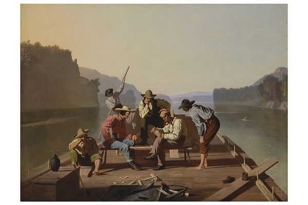 Editor: This is "Trolling for Pike in the River Lee" by James Pollard. It gives me a sense of the leisure activities available to a certain class of people. What do you make of its social context? Curator: It depicts a very specific type of leisure, indicative of class. Consider how such scenes might have functioned: were they aspirational, or celebratory of existing societal structures? Editor: So, it's less about the fishing itself and more about the social standing it represents? Curator: Exactly! The river itself becomes a stage for social display. Who has access to this stage, and what stories does it tell? Editor: It’s a powerful point - the painting is a document of social hierarchy, not just a day at the river. Curator: Precisely. Considering art's role in reflecting and reinforcing such power dynamics is vital.