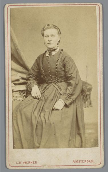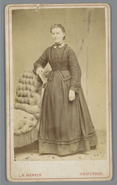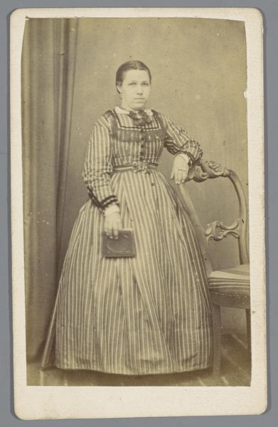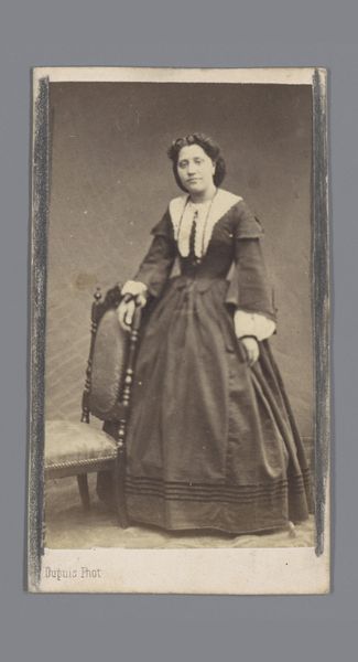 Curator: This is an interesting piece, a gelatin silver print photograph entitled "Portret van een onbekende vrouw, staande naast een stoel," placing its creation somewhere between 1855 and 1885. It depicts an unknown woman. Editor: Immediately, I’m drawn to the almost palpable sense of stillness and perhaps even weariness in this image. Her posture, the way she rests her hand on the chair, there’s a weight to it. Curator: It's compelling to consider the context. Gelatin silver prints revolutionized photography. The process allowed for mass production, bringing photographic portraits within reach of the middle class. It speaks to a democratizing shift in representation. Editor: Indeed. And the very act of having one's portrait taken in this era carries its own symbolic weight. This wasn't just about capturing a likeness; it was about cementing one's place in society, conveying status and respectability. Notice the formality of her dress, the subtle ruffles, and her jewelry. It speaks of aspirations and social positioning. Curator: It’s equally vital to recognize the labor involved. From the photographer meticulously preparing the chemicals and arranging the scene to the subject enduring a long exposure, posing in those restricting clothes, so very heavy perhaps in warmer weather. This speaks to the social performance embedded in portraiture and, of course, what's unseen in the final print: how did women experience the limitations on mobility as an embodied restriction? Editor: Thinking of what’s not seen is key here; what is absent. Who was this woman, what was her story, did she achieve all of these projected societal aims? The chair itself also becomes a potent symbol – it’s a prop, a support, but also indicative of a domestic sphere. It almost boxes her into place. Curator: Fascinatingly framed by this perspective! Examining how photography developed technologically, combined with those material restrictions and expectations, exposes how it was very much a tool used to uphold certain class structures and cultural standards, but there were still methods that subjects such as this unknown woman and the photographer employed to exert themselves. Editor: I appreciate the reminders here that there are multiple narratives to be interpreted, even within the still frame of a simple photograph; many levels of aspiration and desire exist here. Curator: Yes, examining the interplay of medium, labour and social forces offers us nuanced access to these stories and reveals them to us in material and psychological frames.