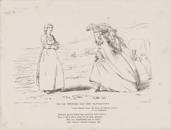 Editor: This is Honoré Daumier's "The Pleasures of a Stroll along the Seine," a print showing fashionable women wading in the Seine while others bathe. The scene looks quite satirical. What symbols are at play here? Curator: Notice how the women’s large dresses and parasols, symbols of status, contrast with the informality of the riverbank. Consider the visual language: Daumier, through satire, critiques societal norms by juxtaposing elegance with the mundane reality of the Seine. Does this contrast evoke a tension? Editor: It does! It's like they're clinging to outdated rituals. Curator: Precisely. Daumier captures a moment of societal flux, where traditional symbols are challenged, revealing deeper anxieties. The image serves as a cultural mirror reflecting the changing tides of 19th-century French society. Editor: This makes me think about how visual cues evolve, how what was once a status symbol might become absurd over time. Curator: Indeed. It reveals the dynamic nature of symbolism, shaped by cultural shifts and historical context.