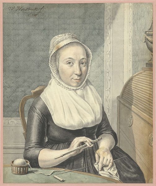 Curator: Up next we have "Portrait of Eva Goudriaan-de Veer," a 1776 oil on canvas work by Cornelis van Cuylenburgh II, on display here at the Rijksmuseum. Editor: She looks…resigned. Or perhaps thoughtful is more generous. I find myself immediately drawn to the color palette though; that muted blue against the darkness is quite striking. Curator: It’s a classic Dutch Golden Age portrait, so restraint is part of the aesthetic. Think about the Dutch Republic in the late 18th century; rising merchant class, emphasis on civic duty, and the domestic sphere. Her posture, her clothing—it speaks volumes about her place in society, her respectability. The book itself symbolizes literacy and education, both becoming increasingly valued for women in her social standing. Editor: True, but let's also consider what that cultivated "respectability" really meant. It was a gilded cage, wasn’t it? Limited choices, prescribed roles, their lives defined by marriage and motherhood. We see so many portraits of women posed with books during this era, yet that visibility might ironically mask constraints and the patriachal forces shaping these realities. Was education truly liberating, or just a performance of virtue to enhance her marriage prospects? Curator: An interesting, perhaps cynical, read of the portrait. I will acknowledge the piece does represent her positioning within societal hierarchies. While these paintings were largely commissioned pieces for specific families and their private circles, public interest in a more 'real' reflection grew, and you begin to see what feels closer to regular life depicted in art. It’s the rise of the bourgeois in art, showing their material wealth, perhaps, but also intimating social changes afoot. Editor: I agree the shift is important! It starts moving art closer to representing actual people with real lives. And perhaps in this woman's serene composure, holding her book, there might indeed be defiance or perhaps something akin to quiet fulfillment. It does push one to look deeper, to think about these figures not merely as decorative but complex human beings in very constrained situations. Curator: Ultimately, paintings like "Portrait of Eva Goudriaan-de Veer" serve as invaluable time capsules for historians, and even catalysts for broader cultural discourse. Editor: I'll leave here reassessing everything I think I know about Dutch portraiture...and Eva's likely life. Art history does it again.