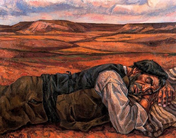 Vela Zanetti's ‘Shepherd at Sunset’ captivates with its rich tapestry of earthy tones and rugged textures. The painting presents a shepherd cradling a lamb, set against a landscape awash in the warm hues of the setting sun. Zanetti employs a palette of ochre, brown, and muted pinks, building up the forms with thick, expressive brushstrokes. Look closely at the shepherd’s face and hands; the texture conveys a sense of weathered resilience, an intimate connection to the land. The composition directs our gaze from the shepherd, the land, and up towards the sky, creating a visual harmony between man and nature. The layering of colors and textures, combined with the semiotic weight of the shepherd and lamb motif, speaks to themes of rural life and the human-animal bond. The sunset backdrop evokes a sense of timelessness, suggesting that these themes remain constant, transcending temporal boundaries. Ultimately, the painting invites us to contemplate our place within the broader natural world.