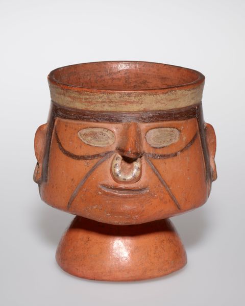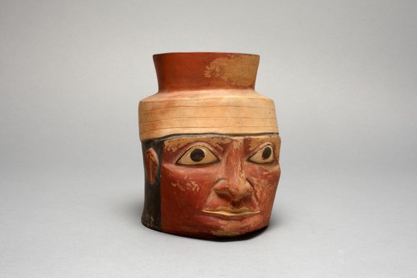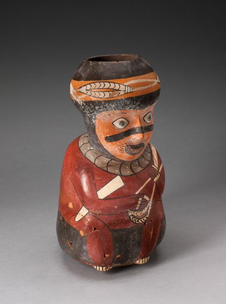 Editor: Here we have a piece titled "Jar in the Form of a Figure with Modeled Head and Painted Tunic," crafted by the Moche people around 100 to 500 AD. It's a ceramic sculpture, fairly small in scale. The figure's expression is rather stern. What story do you think it tells? Curator: Well, I see more than a simple story here. Think about the clay itself, sourced from the earth, and how it’s been transformed by human hands, using specific techniques of modeling and painting, to become this vessel. This isn’t just about aesthetics, but about labor, resources, and the technology available to the Moche people at that time. Consider the social context: was this mass-produced or individually crafted? Editor: That's fascinating! It does look carefully crafted, though I guess mass production is relative given the time period. What was the function of something like this? Curator: Function is key! Was it for ritualistic purposes? Storage? Was the creation process imbued with spiritual meaning? The tunic designs may offer some insight into this individual's societal role. How does its design, the materials employed, connect to their systems of power and belief? Editor: So you're saying understanding the 'how' of its creation gives us clues to the 'why' it was created? Curator: Precisely! The jar itself isn’t just a static object, it's a product of its material conditions and a reflection of the society that made it. Consider who had access to this level of craftsmanship and how that impacted social standing. Editor: This changes my perspective completely. I was focusing on the 'who,' but you've really brought the 'how' and the 'why' into sharp focus. Curator: Right! Seeing art as a product of material and social forces is crucial to unlocking deeper meanings. Editor: Absolutely! It gives the piece a completely different dimension. Thanks!