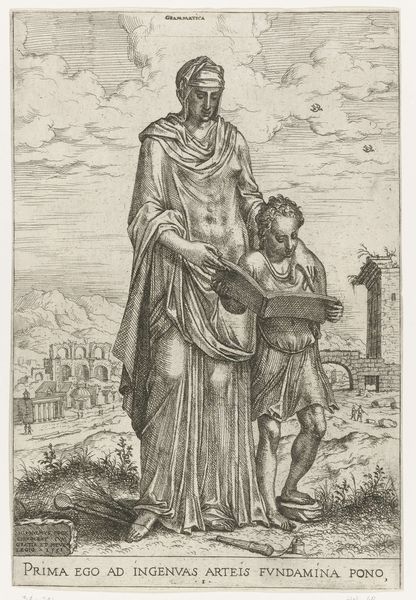 Editor: We're looking at Hieronymus Cock's "Industria," created in 1551. It's a detailed engraving, full of line work. I’m struck by how the central figure dominates the scene, but the supplicant at her feet really complicates the reading. What do you see in this piece? Curator: Focusing purely on the visual, we can consider how Cock deploys line to articulate form. Observe the varying densities of hatching; they define the drapery and musculature with considerable skill. The linear precision contributes to a sense of classical order, despite the potentially chaotic subject matter implied by "industry" itself. Note also the way the horizon line bisects the composition. Do you think that division is intentional? Editor: Possibly, setting up the ruins and open space as separate but equally crucial elements. They're more than mere backgrounds. The linear perspective leads my eye to them directly. Curator: Precisely. Consider, too, the use of contrasting textures, smooth skin juxtaposed with the rough-hewn landscapes, or architectural features. How do those oppositions affect your understanding? Editor: The stark contrast makes the textures much more defined, highlighting their qualities, especially because of how different they are, maybe emphasizing a clash between chaos and order? I didn't notice it right away. Curator: Indeed, the artist's hand deliberately guides us to discover nuances embedded within these deliberate formal arrangements. Notice how the lines curve and flow to add to this theme. Editor: I'm appreciating the balance between the detail and the overall composition more now. Paying closer attention to those relationships opened it up. Curator: And the artist succeeds in conveying layers of significance through skillfully manipulating the elements. Thank you.