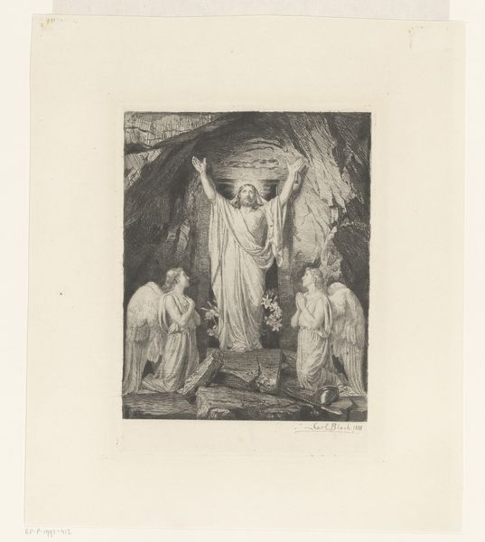 Curator: William Blake's watercolor, "The Entombment," now held at the Tate, presents a powerful image of grief and reverence. Editor: It's striking how Blake uses dark, muted tones to create a somber mood. There's a definite sense of collective mourning, but also a stark stillness. Curator: Indeed. Notice the centrality of the candle flame—a potent symbol of the soul’s enduring light, even in the face of death. It’s a recurring motif for Blake. Editor: And how Blake uses the figures to create a community gathered around loss; their veils are a reminder of how grief obscures and transforms identity. Curator: The composition, with its arched tomb entrance, almost echoes the shape of a halo, suggesting transcendence, a hope for resurrection. Editor: I appreciate how Blake connects personal sorrow with grander themes of sacrifice. The artwork offers a commentary on historical trauma and its cultural memory. Curator: Blake allows us to feel the weight of this moment, yet also hints at the potential for spiritual rebirth. Editor: It’s a powerful testament to art’s ability to connect us to our deepest emotions.