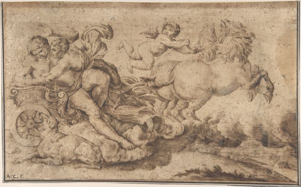 Editor: This drawing, "Sea Deities," from the 17th century, shows various figures rendered in pen and ink. There’s an energy here, a chaotic beauty. What symbols jump out at you, what stories do they tell? Curator: It’s interesting you mention stories, because that's precisely what images like these did; they communicated narratives packed with symbolism. Notice how the sea, with its creatures and deities, becomes a metaphor. Consider the trident: not merely a fishing spear but the power to stir or calm the seas – representing dominion, but also divine favor. And those horses? Editor: Are those horses drawing Neptune's chariot, symbolizing his power and the vastness of the ocean realm? Curator: Precisely! Look also at the embrace between the deities in the center. It hints at union, fertility, maybe even conquest. In this period, visual representation of mythological narratives served as an emblem for expressing one’s erudition, to signal philosophical, aesthetic and ethical awareness. Are there elements of drama being performed through symbolic figuration, almost a visual poem being enacted for its viewer? Editor: Definitely! The cherubs add another layer. What’s their purpose here? Curator: They serve as a kind of spiritual compass, a sign of benediction. This drawing could also signify allegories about power, love, or destiny. The pen-and-ink medium contributes to a dynamic, ethereal quality that reflects the fluidity and mysterious depth of the ocean and divine intentions. Does it leave you contemplating ideas about chance, choice and cosmic order? Editor: Absolutely! It’s more than just a mythological scene. It’s about broader concepts of control and destiny represented by characters and details, like the cherubs and the sea itself. I had only considered the artwork for face value representation, so this new perspective helps! Curator: It invites us to unpack complex ideologies represented by figural interactions.