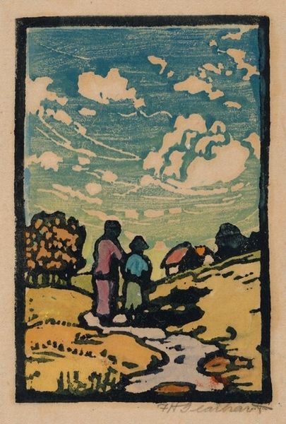 Ernst Ludwig Kirchner crafted this woodcut, titled "Waldfriedhof," utilizing stark colors to depict a forest cemetery. The image is dominated by trees and a central structure that suggests a place of rest or memorial. The forest itself, a motif stretching back to antiquity, has long been a place of mystery and transformation. Across cultures, from the Brothers Grimm's fairy tales to ancient Celtic beliefs, the forest symbolizes both danger and renewal. Here, Kirchner uses it as a backdrop for a cemetery, adding another layer to its symbolic weight. The geometric forms of the trees and the building evoke a sense of unease, perhaps reflecting the psychological impact of mortality. The harsh lines and unnatural colors contribute to a feeling of alienation, a common theme in Kirchner's work, which often delves into the subconscious anxieties of modern life. In viewing this woodcut, one cannot help but ponder the cyclical nature of life and death, and how these age-old symbols continue to resonate within our collective memory.