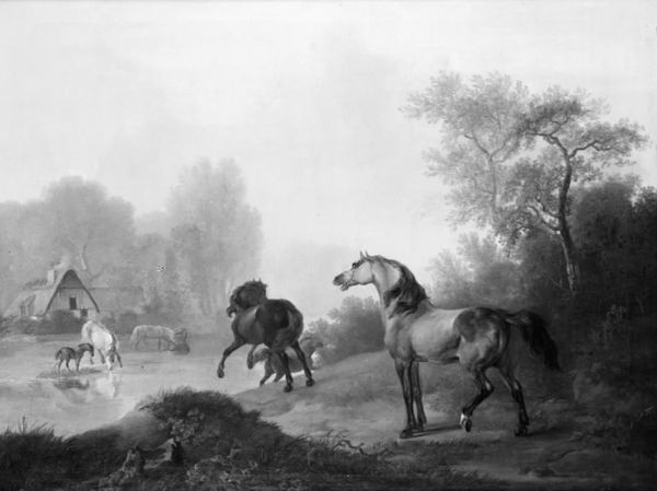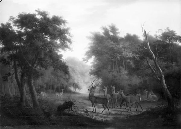 Curator: This monochrome painting, "Keld Skov ved Frederiksborg" by Christian David Gebauer, made between 1792 and 1825, shows a rural landscape with livestock. Editor: The atmospheric perspective in the black and white image creates a sense of depth, but it almost flattens the scene into a pattern. What does this choice to remove the color emphasize to you? Curator: Given its probable time of production, this work exists on the cusp of industrial agriculture, and looks longingly towards older methods, though probably in a quite patronizing manner. I'm interested in the relationship between the means of representing this labor, this rural idyll, versus the messy reality of land ownership and animal husbandry. How does painting transform labor into consumable imagery? Editor: That's interesting! So, you're suggesting it presents a somewhat idealized view of labor? Is that also potentially reflected in the way that it is rendered in monochrome, perhaps aestheticizing it? Curator: Precisely. Monochrome here, far from being simply a technical choice, actively participates in that idealized consumption, softening the harsh realities of labor for the emerging urban art market. We're not just looking at a pretty picture, but a carefully crafted narrative meant for a specific consumer. Consider, also, that this piece seems unfinished. Do you think that that intentional artistic gesture further elevates "high art" over craft in order to generate value? Editor: I hadn't considered the incomplete state of the work adding to that narrative. Now, I'm seeing the piece less as a peaceful scene and more as a commodity in itself, reflecting larger societal shifts and romanticism of rural life. Thanks for sharing a fascinating perspective! Curator: My pleasure! Always try to consider artwork a type of "capital", beyond only considering beauty.