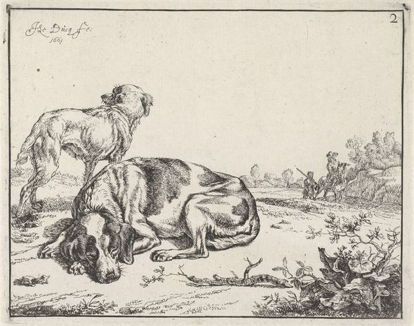 This etching, *Reu en teef*, was created by an anonymous artist. The image depicts a pair of dogs in the midst of mating. The act of pairing, especially within the animal kingdom, has long been a subject of fascination and contemplation across various cultures. In the absence of a known artist, we might interpret this artwork through the lens of broader societal attitudes towards sexuality, fertility, and the natural world. What does it mean to depict this raw, unfiltered moment of animal instinct? Perhaps the artist sought to capture a sense of natural harmony, where the roles of male and female are clearly defined and instinctually understood. Or the artist was observing a natural spectacle that in its most basic essence would lead to the creation of new life. Ultimately, *Reu en teef* invites us to reflect on our own perceptions of nature, desire, and the fundamental drives that shape both the animal and human experience.