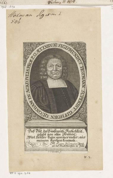 Editor: Here we have a portrait of Johann Ulrich Riedner, created in 1708 by Hieronymus Böllmann. It’s an engraving, giving it such precise lines. What strikes me is how formally composed it is, and that elaborate ruff. What do you see in this piece? Curator: The ruff is indeed fascinating! It represents more than just fashion. Think of the circle as a symbol of completeness, of enclosure. He's visually walled off, separate. And then there's his pointed finger. It acts almost like an accusing arrow, a learned admonition. But pointing at what, or at whom? Is he referring to the text beneath his image or the book in front of him, the viewer? The gaze goes toward the viewer, bringing them in and creating an ambiguity to the subjects power over the text and how its wisdom may, in return, impact his viewer. Editor: That's a powerful reading! I hadn’t considered the way the ruff isolates him. The pointing finger definitely adds a layer of complexity too. Is it supposed to be confrontational? Curator: Confrontational perhaps, but also instructive. Consider the era – Baroque. Power, knowledge, and divine right were visually asserted. But, notice the gentleness in his eyes; a wisdom tempered with humanity. He might challenge, but he does so for your own improvement, reflecting the ideals of both piety and humanist scholarship common at the time. What we are perceiving as aggression, perhaps represents his faith. Editor: So, the symbols aren't always straightforward! Thank you! Curator: Indeed. The layering of symbolism provides continued fascination, reflecting culture and the human condition through art, so this image acts almost like an individual performance of those memories.