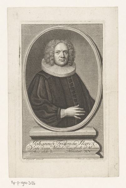Curator: This engraving, a "Portret van Fredericus Ernestus Kettner," created sometime between 1687 and 1743 by Johann Georg Mentzel, really makes you think about the power of print in disseminating images and ideas. The sheer labor that goes into this kind of work is stunning, right? Editor: Absolutely. The details are incredible for an engraving. It almost looks like it's been etched, you know? What strikes me most is the formality. It's stately and a bit… severe, perhaps. How do you interpret the piece? Curator: Well, for me, the materiality speaks volumes. The choice of engraving – a medium inherently tied to reproducibility and widespread distribution – suggests this wasn't just a portrait for private enjoyment. Consider the social context: Who had access to such prints? Who was this portrait intended for? Was it meant to bolster Kettner's position or disseminate his image? Editor: That’s fascinating. So you're focusing on the role of the print itself as a commodity and a tool? Curator: Precisely. Look at the rendering of fabrics, the hair, the lettering - all meticulously crafted to create a visual statement. This highlights the craftsmanship, and points towards consumption: Who was purchasing and displaying such images and what did it signify for them? This portrait is less about the individual and more about the system of representation in this era. How it was made and distributed becomes essential. Editor: I hadn’t thought about it that way, but I see what you mean. It connects directly to his status through its accessibility as an image, thanks to the medium. Curator: Exactly. And that accessibility reflects power, influence and a certain degree of control over his own image in the public sphere. This isn't just a portrait, it’s a carefully constructed brand identity using the technology available at the time. Editor: That's given me a completely different perspective on this kind of art. I will keep it in mind.