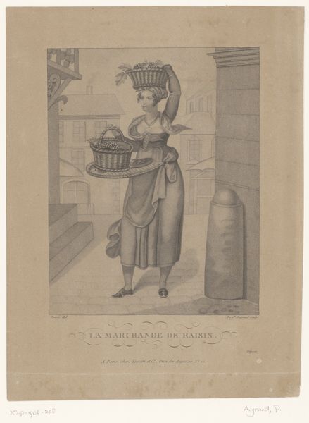 Editor: This is "Girl with a Basket of Fruit" by John Dixon, created sometime between 1720 and 1804. It's a print, and what strikes me most is how it blends the everyday with an almost idealized portrait. What does this artwork tell you about the society it came from? Curator: It’s fascinating how this print appropriates and circulates imagery. The composition clearly echoes classical themes and poses that were in vogue, part of the Neoclassical movement. Yet, Dixon democratizes art by making it accessible, translating this image into print, which was reproducible and far cheaper than an oil painting. Consider who the intended audience might have been and the increasing significance of print culture. Editor: So, it's taking a high art concept and making it available to a wider public. I wonder what that says about art’s function at the time? Curator: Exactly. This print reflects a shifting socio-political landscape where access to imagery became increasingly important. While the artwork idealizes a ‘genre scene’, it raises interesting questions: who gets to be portrayed? What messages about virtue and value were being propagated? And, significantly, how does accessibility reshape art's societal role? Think about how the institution of the art market starts changing too. Editor: That makes me wonder, does the choice to depict a ‘commoner’ elevated to portrait status actually challenge social norms or simply reinforce existing class structures? Curator: A crucial question to ask. By idealizing a ‘commoner’, Dixon's print treads a fine line. Is it celebrating the dignity of labour, or romanticizing poverty for a wealthy audience? Was this merely fashionable, like the *bergère* style that Marie Antoinette adopted at court? This points to the complexity of the image and the values it attempts to portray. What is more is the use of print-making allowing images and ideology to propagate quicker and easier within a specific time frame. Editor: I never thought about it like that before! I'm learning to look beyond the immediate image and consider the forces at play that shaped its creation and consumption. Thanks! Curator: Precisely. Considering the socio-political implications encourages a richer and much more revealing understanding of the artwork's broader purpose and effects.