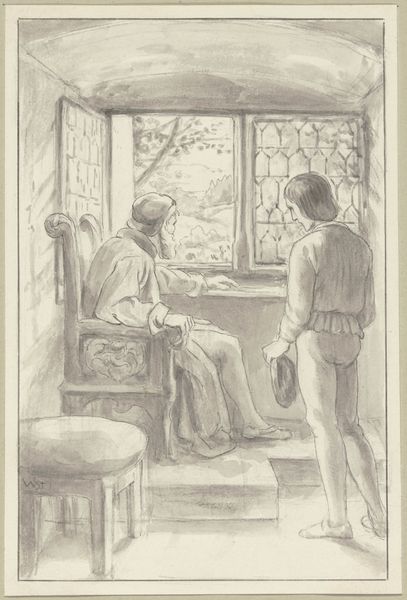 Editor: Here we have Niels Larsen Stevns' "Five Sketches for Fresco Decorations in the H.C. Andersen Memorial Hall in Odense," created between 1931 and 1932. It looks like a watercolor and drawing piece. The palette is so soft, and there’s this delicate, almost dreamlike quality. I wonder, what’s your take on this? What strikes you when you look at this work? Curator: You know, it feels like peeking into a memory, doesn't it? Or perhaps a carefully staged tableau vivant? The colors are muted, intentionally, I think, to evoke a sense of nostalgia. And the frame – it feels almost like we're looking through a stereoscope into a bygone era. Notice how the figures are positioned, seemingly engaged in a dramatic recitation or presentation. I almost wonder, do you get the feeling they’re trapped in their moment? Editor: A bit, actually. They all seem really absorbed in that space. What's interesting to you about its purpose as a 'sketch' for fresco decorations, versus seeing it as a stand-alone piece? Curator: Oh, that's crucial! Understanding it as a preparatory work shifts everything. It allows us to appreciate the artist's process, his experimentation with composition, color… How he might have envisioned transforming this intimate watercolor into a monumental public artwork! It also illuminates Stevns’s creative mindset: were his fresco decorations realized faithfully according to these sketches? What might be lost or gained in translation? Editor: I see, it’s like glimpsing the seed of a grand idea. Thanks, it is interesting to consider its significance, both for what it is and what it anticipates. Curator: Absolutely. Art isn't just the final product, is it? It's the whole journey – the "what ifs" and the "maybes" – laid bare for us to ponder.