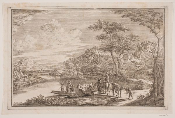 This print, Plate 5 from 'Troops, cannons, and attacks on towns' was etched by Stefano della Bella in the 17th century. Notice the composition, which divides the scene into distinct registers. The foreground presents a detailed depiction of horsemen and a prominent tree, while the background fades into a more generalized landscape featuring a bridge, distant figures and faint smoke. Della Bella masterfully uses line to define form and space, creating a sense of depth and movement. The diagonal lines of the landscape and the procession of figures draw the viewer's eye across the scene. The central tree acts as a structural anchor, its branches reaching out to frame the sky and provide a counterpoint to the linear movement of the troops. Consider how the artwork destabilizes established meanings. Is this a celebration of military might or a commentary on the chaos and displacement of war? The delicate lines and balanced composition invite contemplation.