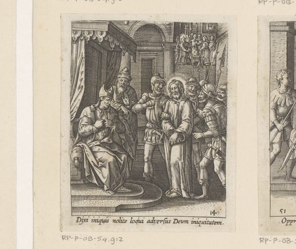 Editor: This engraving, "De deugdzame vrouw koopt een akker" from 1555 by Dirck Volckertsz Coornhert, portrays a scene bustling with figures. It’s currently housed in the Rijksmuseum. I am struck by the composition and how detailed everything is, but I’m struggling to understand the visual language used here. How do you interpret this work? Curator: Initially, one is struck by the spatial construction, isn’t it? Notice how the foreground figures, with their pronounced drapery and individualized expressions, are carefully arranged to lead the eye towards a background filled with minute detail. Consider the relationship between the central woman and the surrounding men; what does their placement suggest about the power dynamics within the piece? Editor: I see that, almost like a stage. The woman is the central focus. The lines, especially in her garment, create movement. Curator: Precisely. Observe how Coornhert utilizes a complex system of cross-hatching to create tonal variations, providing volume and depth. It isn't merely descriptive; it's integral to the emotive impact. The surface becomes activated, imbued with a certain nervous energy that complements the subject matter. Do you notice the use of light and shadow and where it’s concentrated? Editor: Yes, the artist uses it to emphasize key figures, adding another layer to how our eyes move around the engraving. The lightest parts definitely make figures seem more important. Curator: And how do you think the linear nature of the engraving, versus painterly approaches of the same era, contributes to the piece's overall feeling and meaning? It does seem appropriate, somehow. Editor: Now I can see that each choice made about line, form, and light adds meaning and contributes to a much deeper analysis than I realized before. Curator: Indeed. Paying attention to these formal elements grants a richer understanding of the artwork itself.