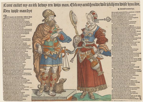 This anonymous print, probably made in the Netherlands, uses woodcut and hand-applied color. These were techniques accessible to many printers, allowing for the mass production of images. Look closely, and you'll see broad outlines defining the figures of an old man and a younger woman. The flat application of color emphasizes the graphic nature of the image, rather than attempting realism. The story told here is one of unequal love, likely intended as a moral commentary. It is difficult to tell how long the production took, though it's part of a history of printing that relied on dividing tasks between draughtsmen, carvers, and printers, each with their own skill sets. These workers were part of a complex economic system, producing affordable images for a growing market. The very accessibility of this print underscores the rising power of consumer culture. Ultimately, this artwork speaks to the democratization of image-making, and reminds us that even seemingly simple objects can carry complex social meanings.