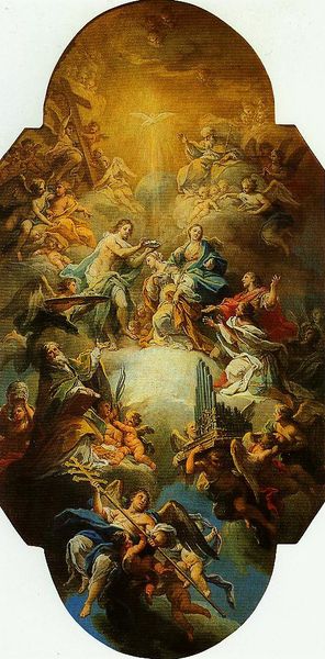 Editor: This is “Cristo in Gloria Con Apostoli E Santi Francescani,” an oil painting by Giovanni Battista Gaulli. It certainly seems to depict a heavenly scene with many figures ascending upwards. The composition is a bit overwhelming; where does one's eye even begin? What is your interpretation? Curator: Indeed, the dynamism within the painting arrests the gaze. Notice how the artist’s strategic arrangement guides the observer upwards through carefully considered perspectival techniques. How does Gaulli use light to shape form? Editor: I see that the higher figures are brighter, whiter and much more luminous, giving them greater importance. Also the higher one looks the less sharply rendered things seem to be, which does really create an illusion of distance and haze. Curator: Precisely! This strategic implementation is crucial for spatial organization within the artwork. Let's look at color composition and arrangement within. We note the limited chromatic scale which unifies various segments. How do color choices help direct our focus? Editor: The strategic placement of blues and reds throughout guides us, acting like stepping stones, upward to the painting's apex. It all feels masterfully considered to emphasize certain formal and perspectival qualities! Curator: Your insights align perfectly. Observe, too, the Baroque aesthetic visible in the rendering of form. These are rendered and organized in such a way to heighten our perception, inviting emotional resonance through calculated optical effects and strategies. Editor: It is fascinating how technical and optical effects affect emotion in the viewer! I learned to notice how composition and color influence how one feels. Curator: An art work becomes a complex set of structures, and analyzing the relational qualities inherent within unlocks so much understanding. Keep exploring.