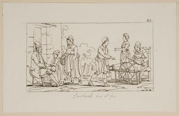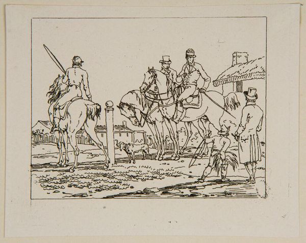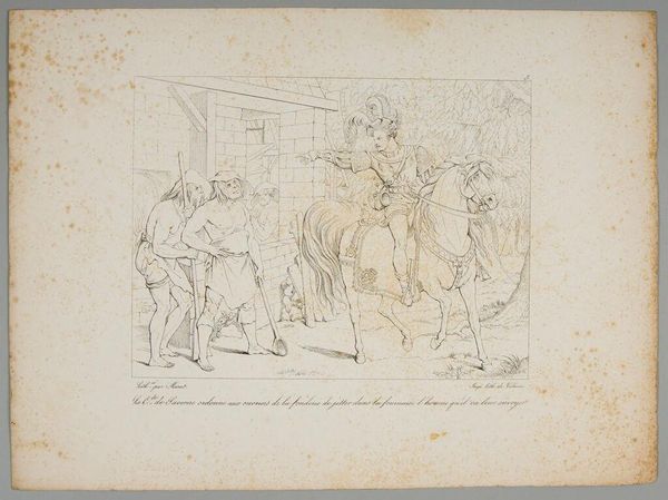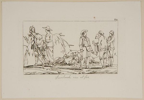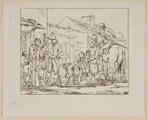 Editor: This is "Plate XLIX" by Jacques-Francois-Joseph Swebach at the Harvard Art Museums. It depicts a scene with soldiers and civilians. What strikes me is the clear hierarchy in the composition. How should we interpret this power dynamic? Curator: It's crucial to consider the social structures of the time. This piece likely reflects the unequal power dynamics of military occupation. Notice how the central figures are the mounted soldier and the supplicating civilians. This is not simply a depiction of everyday life; it reinforces existing hierarchies. Editor: So, it's not just a snapshot, but a commentary on authority? Curator: Precisely. Swebach, consciously or unconsciously, illustrates how power is performed and negotiated, highlighting the vulnerability of the civilian population in the face of military force. It makes you question the normalized violence of such encounters. Editor: That gives me a lot to think about. Curator: Indeed, art often functions as a mirror, reflecting and sometimes reinforcing the societal norms we must critically examine.