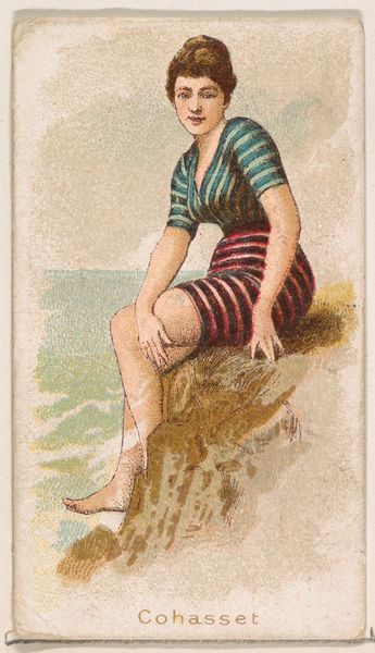 This chromolithograph called Dieppe, from the Fancy Bathers series was issued by Wm. S. Kimball & Co., presenting a bathing beauty by the sea. The maiden adjusting her hair is an intriguing gesture, laden with cultural history. We find echoes of it in classical depictions of Venus emerging from the sea, a motif symbolizing beauty and renewal. Yet, here, it's transposed onto a modern woman, a bather in a striped suit. This is not the goddess herself, but the gesture persists, now tinged with contemporary self-consciousness. The act of adjusting hair transforms from a divine act to one of personal grooming, a subtle but significant shift in meaning. It serves as a powerful force, engaging viewers on a deep, subconscious level. What was once an embodiment of godly beauty is now a private moment made public. We are reminded that these gestures are not static, but fluid, changing with time and societal norms. They are reborn again and again, revealing our complex relationship with beauty, identity, and representation.
