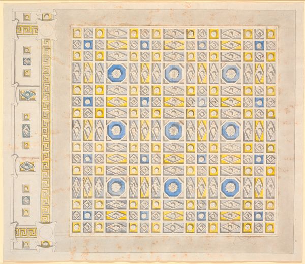 Curator: Up next we have a drawing attributed to Nicolai Abildgaard, created sometime between 1743 and 1809. It's titled "Udkast til et loft med ottekantede, sekskantede og kvadratiske kassetter i gult og lilla" or "Draft for a ceiling with octagonal, hexagonal, and square coffers in yellow and purple". Editor: The instant feeling is a very organised yet almost unsettling geometry, and yet the pastel shades offer a real calming contrast! Curator: Precisely! It's a proposed design for a ceiling, all meticulously drafted. Notice the interplay of shapes; the octagons frame circular forms. How might such a pattern engage in lived space do you suppose? Editor: Well, you’d have to look at who’s paying for it, right? These kinds of ceiling coffers scream opulence! Were talking about the labor required and also access to quality pigments. I wonder who had that sort of access, in late eighteenth century Denmark. Curator: Good point. Given Abildgaard's background—director of the Academy, history painter—we could assume that he'd be drafting such design elements for aristocratic spaces and wealthy patrons! Perhaps even a Royal commission? Editor: That makes sense. Thinking about these ornate coffers, I picture craftspeople carefully gilding, adding to this vision and embedding these forms onto the architecture to display not only material wealth but cultural status. It really pushes boundaries to think beyond fine art. Curator: Absolutely. He was engaging directly with architectural design! His work extends into spaces typically segregated from easel painting. The colours themselves are very delicate; there's an ethereal almost otherworldly feel, despite the rigid geometric structures. Editor: Right, it becomes less about mere utility or surface adornment. It elevates craft through its intellectual execution, especially when it enters the art history discourse, isn’t it? Curator: Certainly! By acknowledging this "draft" and bringing together material context with design thinking we start to grasp Abildgaard’s work in much more exciting and holistic light. Editor: Exactly, looking at the work in terms of consumption and craftsmanship invites so much conversation, whereas considering formal style it often obscures those ideas.