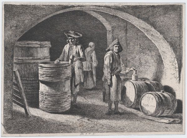 Editor: This is Jean-Jacques de Boissieu’s etching, "The Coopers," created sometime between 1790 and 1900. The level of detail in this scene of barrel makers is captivating, yet the heavy shading makes me feel like I'm peeking into a hidden world. What historical perspectives can you offer about this artwork? Curator: Considering the social and cultural context, the cooper's trade was vital. Before mass-produced containers, barrels were essential for storing and transporting goods. Images like this served as documentation of everyday life, raising the status of labor, but were often commissioned or acquired by wealthy patrons, creating a complex dynamic. What do you notice about the way the figures are represented? Editor: Their clothing seems simple but appropriate for their labor, though the man at the far right appears more formally dressed than the rest. I wonder if his apparel signifies a hierarchy or different role. Curator: Precisely! It's important to ask who this print was intended for. Was it to celebrate labor, to exoticize it, or something else entirely? Prints were easily reproduced and disseminated. Think about how its accessibility could impact the reception of the cooper's life within different social classes. Could it influence the perceptions of work and value in society? Editor: It’s interesting how art could influence people's perception and appreciation of trades like these. So this is more than just documentation, but could be read as commentary on social status through occupation. Curator: Exactly. Understanding art means delving into not just the images themselves but how the museum system, the markets, and different sociopolitical factors affect both its creation and understanding by future generations. Something to continue to reflect on! Editor: I never considered how those underlying elements influenced our interpretations, really enlightening!