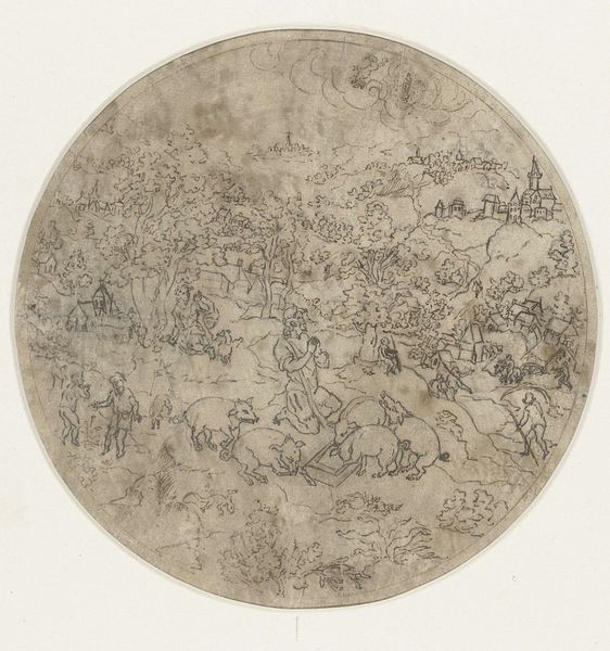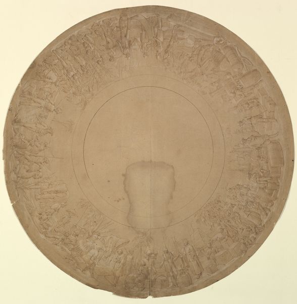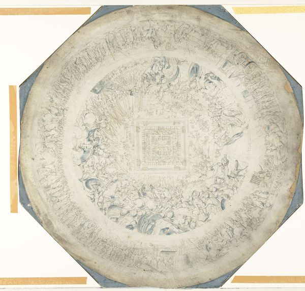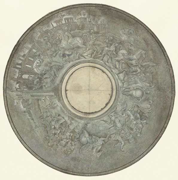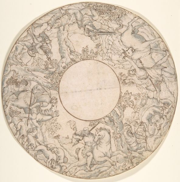 Mattheus Terwesten made this design for a ceiling piece with pen and grey ink, likely as a study for a larger painted work. The material here, paper, is humble, but also crucial. It takes the artist away from the wall and into the studio. The quick, fluid lines capture figures representing the four winds, floating amid clouds in an ornate, Baroque style. While the drawing itself appears effortless, this belies the intense labor involved in producing such ornamentation on a large scale. Ceiling paintings, particularly in the 17th and 18th centuries, demanded immense skill, not only in artistic technique but also in the physical exertion of working at height. Terwesten, like many artists of his time, would have relied on workshops and assistants to execute these grand schemes. So, even a sketch like this offers a glimpse into a complex system of production and the skilled labor needed to create these immersive environments for wealthy patrons. It reminds us that artworks were always the product of many hands.