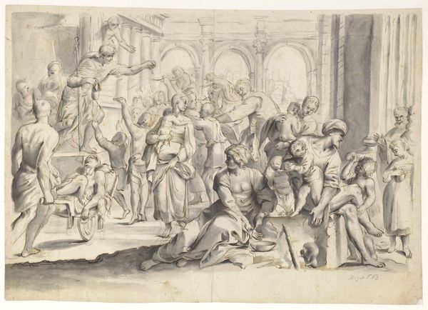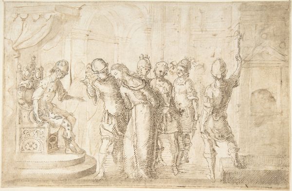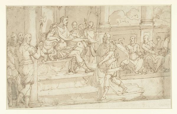 Editor: This is a caricature of Lord Burlington, done by the British School in the 18th century. It looks like pen and brown ink on paper, and the composition is unusual, almost surreal. What do you see in this piece, considered from a formalist point of view? Curator: The artwork's compositional balance is intriguing, is it not? The artist has positioned Lord Burlington to dominate the space through layering, yet the figure is not the focal point. Note how the linear perspective draws the eye not to the sitter's likeness but instead to the background and the play of light and shadow. Editor: That's a great point. I see how the artist uses line and form to create a sense of visual tension. Curator: Indeed. Also, the work is far from photorealistic. It is an exploration of form and perspective. Editor: I appreciate your insight into how the artist played with composition to create this unusual portrait. Curator: And I, your eagerness to engage with formal elements.