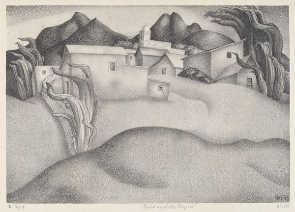 Loraine Moore made this print of Picuris Pueblo sometime in the mid-20th century. The print shows the Pueblo under a night sky with a cloud, which may reference the history of the Pueblo's resistance to attempts to extinguish the traditional religious practices of its people. Moore depicts the Pueblo using simple shapes and earth tones. The crosses above the buildings are markers of the enforced history of Christianity in this region, but the ladders and adobe construction also indicate the persistence of traditional ways of life. Moore’s work belongs to a genre of images of the American Southwest that valorize a simple way of life rooted in the land. To understand this image better, one could research the artist's biography, the history of the Pueblo, and the cultural context in which the image was made. As historians, it is important to understand the role of art in the creation and maintenance of cultural identity and the complex social, economic, and political factors that shape its production and reception.