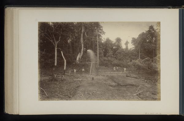 Curator: Here we have "Werkzaamheden aan de drainage op de Stabat plantage, Sumatra," or "Working on the drainage at the Stabat plantation, Sumatra." It's a gelatin silver print dating from around 1890 to 1900, housed here at the Rijksmuseum, and attributed to Heinrich Ernst & Co. Editor: Wow, a gelatin silver print capturing a tropical locale. There is a haunting quality to it, an unsettling beauty. I am immediately drawn to the contrast, those shadowy trees looming on the left versus the open sky further down the channel, framing that human activity. Curator: It's a striking image. Note how the eye is drawn along that sharply receding canal. It carves a line through the scene, physically and metaphorically shaping the land. Look at the groups of workers, some waist-deep in the trench, others lining the banks. Editor: That receding line creates this illusion of endlessness. It really makes you question the scope of the operation. There is something dehumanizing about the repetition, though. What strikes me, too, is how the light interacts with the scene – reflecting harshly off the water and damp earth, obscuring individual features. It highlights the systematic nature of the project. It reminds you how difficult and draining it would be, especially physically. Curator: Precisely, the near monochrome and stark contrasts really underscore the laborious process. The viewpoint, placing us above and slightly removed, is also revealing. It suggests an overview, control, almost a surveillance. Do you find it lends to the photo’s exotic orientalism? Editor: Yes, absolutely. There’s a palpable sense of distance, an implied separation between the viewer and the people doing the actual work, further emphasized by that elevated angle, that supervisory gaze. But beneath the "orientalist" gaze, there is an underlying feeling of something… amiss. I suppose the photo invites us to consider what wasn't photographed or discussed—the social and political backdrop. Curator: Indeed. Looking at the light and shadow, and that canal stretching far into the horizon, it's clear that there is much more to this single snapshot. Editor: This picture reminds us that a seemingly straightforward depiction can ripple with unspoken questions. It's quite thought-provoking, really.