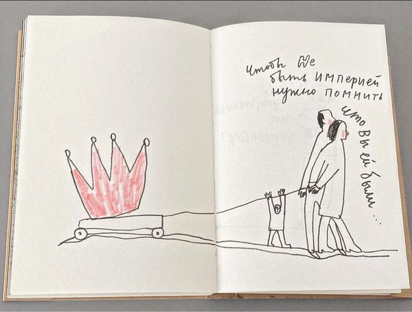 Here’s an Untitled piece by Alevtyna Kakhidze, made with what looks like felt-tip pens, maybe crayons, on paper. The directness of the marks and the rawness of the color are so upfront, there’s no hiding here. It’s like looking at someone’s diary. I am struck by how the quality of the line itself makes you feel something. There’s one figure, slumped, with a sort of red cloud hovering nearby; the cloud seems to speak for the figure, or maybe threaten them. And then another figure, standing, holding a gun, next to a waving Russian flag. The marks are so immediate, and yet they speak to a much larger conflict. What’s interesting is, that although it’s such a simple image, it reminds me of some of Picasso’s more overtly political drawings, which were also about war and suffering. I guess art is always in conversation with itself, and with the world, isn’t it? Even when it’s at its most direct and seemingly artless.