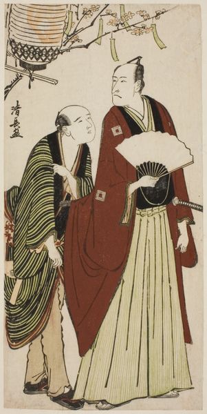 Editor: Here we have Katsukawa Shuncho's woodblock print, "Akiba, from the series 'Three Evenings at Spots Famous for Snow Viewing'," dating roughly from 1780 to 1801. It strikes me as quite dynamic. What is your interpretation of this work? Curator: Dynamism is indeed present. The composition exhibits a compelling arrangement of line and form. Note the distinct linearity in the rendering of clothing and architectural elements contrasted with the flatter expanses defining sky and snow. It compels one’s eye throughout the picture plane. Editor: The linearity is fascinating. I also notice a limited, muted color palette. What does the interplay of color contribute, in your view? Curator: The restricted palette works structurally, delineating spatial relationships. The pale ground amplifies the relative saturation of hues employed for the figures' robes. What might appear as a mere representational strategy functions profoundly within the pictorial space itself, creating layers of visual interest. Editor: That’s a really interesting observation about spatial relationships and color saturation. Is the woodblock print medium a key element, and how? Curator: Certainly. The woodblock technique enforces a reliance on the linear, enabling stark contrasts and distinct zones. This artwork invites engagement not simply as depiction, but foremost as construction, as arrangement. Editor: So the formal elements take precedence in understanding and appreciating it. Thank you! Curator: Indeed. The structural arrangement warrants continuous engagement. It transcends simplistic interpretation.