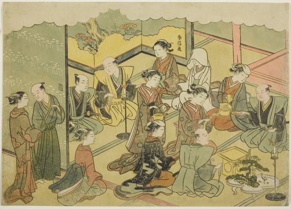 This colorful woodblock print, "Women Washing Clothes," was made by Torii Kiyonaga in the late 18th century, portraying a scene of women engaged in domestic tasks. At first glance, one sees a mundane activity, but consider the deeper currents: the women are depicted in the heart of their daily lives, surrounded by water. Water, universally, carries the powerful symbolism of purification, fertility, and renewal. It has been used in sacred rites from ancient times, from baptism to ablutions. Here, the women are not merely cleaning fabrics; they are participants in an act of cleansing that subtly echoes through cultural memory. We see similar gestures throughout art history: the careful draping of textiles recalls classical depictions of figures like the Virgin Mary, and the act of washing is reminiscent of biblical scenes. Like so many images that echo throughout time, the work touches on deep-seated collective memories and evokes primal, subconscious connections. The emotional weight of these symbols continues to engage us, drawing us into a cyclical progression of images and meanings.
