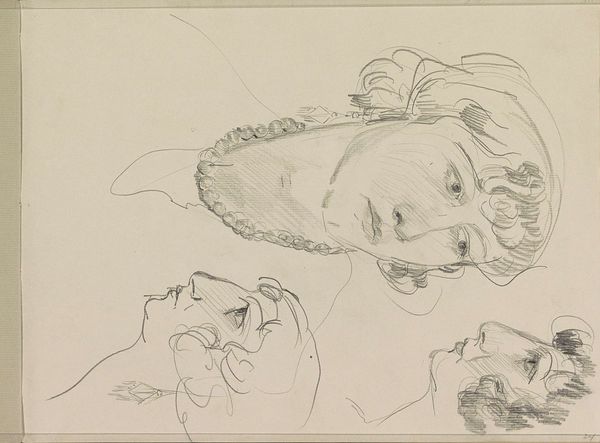 Carel Adolph Lion Cachet made this drawing of Joanna Lion Cachet-Cordes and a man with a hat, probably in his studio, with pencil on paper. Look at the tentative, searching lines, the quick scribbles defining form – it's like watching the artist think! I love how the simple act of putting pencil to paper can reveal so much. See how Cachet uses line weight to suggest depth, the hatching creating a sense of volume. The texture of the paper itself adds another layer, grounding the ethereal quality of the sketches. Notice the man's hat, how its shape is suggested more than defined, each line carrying the energy of the artist’s hand. This reminds me of some of Philip Guston’s quick drawings, capturing a fleeting thought before it disappears. Art isn’t about perfect representation; it's about embracing the messy, the unfinished, and the open-ended nature of perception.
