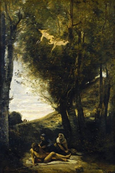 Editor: So here we have Camille Corot's "Les Dénicheurs Toscans", created around 1855 to 1865, an oil painting which, at first glance, has a serene, almost dreamlike quality. I’m really drawn to the figures nestled within this landscape. How do you interpret this work? Curator: Formally, consider Corot’s rendering of light. Notice the sfumato, the subtle gradations, particularly in the foliage, lending this atmospheric quality. The composition draws your eye from the darker foreground, where the figures reside, up to the softly defined architectural mass in the distance. Editor: The brushstrokes in the foreground seem so loose, almost impressionistic. Curator: Precisely. Observe the tactile quality of the paint itself. How does Corot’s application, thick in areas and thin in others, contribute to the overall impression? What is the interplay between the solidity of the trees and figures and the almost dissolving background? The use of the verdant greens and muted browns creates tonal unity, would you agree? Editor: Definitely. I see now how the textures and tonal harmony really create a unified experience despite the varied elements in the painting. The light seems almost to unify all the objects together. Curator: Exactly. It transcends mere representation, inviting introspection on the nature of vision and perception itself. Editor: I had only seen it as a landscape painting, but now it's fascinating how he manipulated these materials to create that effect. Thanks!