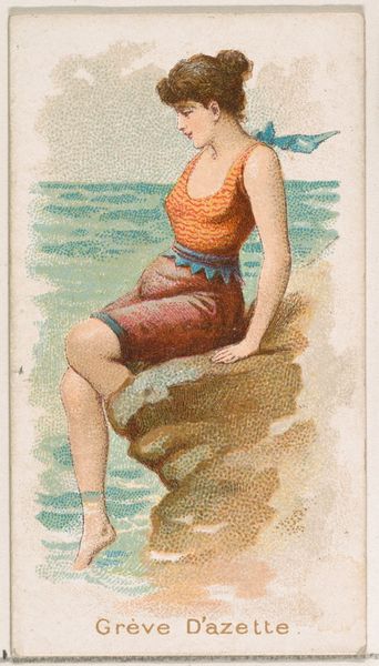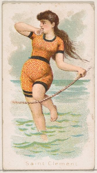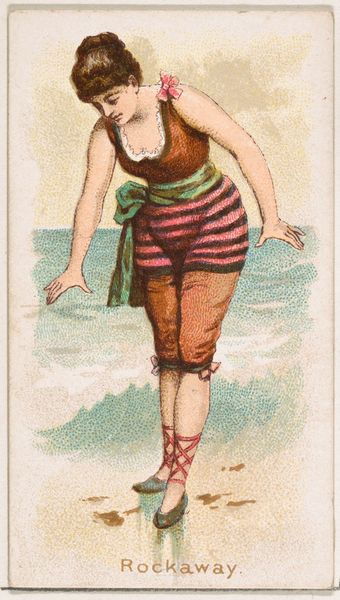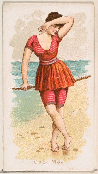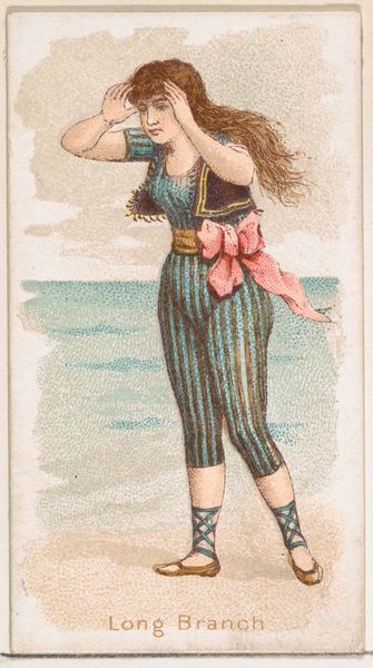 Editor: This is "Santa Barbara, from the Fancy Bathers series," a coloured-pencil print from 1889, credited to William S. Kimball & Co. The bathing suit is fascinating - so stripey and modest, yet rather shapely. What’s your take on this? Curator: Well, darling, aren't we all just a little stripey and modest, yet secretly craving to be shapely, metaphorically speaking of course? But to answer your question seriously, this work offers a peek into a very specific slice of Americana, a moment when leisure and fashion collided in the late 19th century. It's less about deep artistic expression and more about a beautifully rendered snapshot of the aspirations and aesthetics of the time. Notice how idealized the figure is, how controlled yet carefree. What do you feel she's thinking about, standing at the water's edge? Editor: Maybe she is excited to get into the water, and just enjoys feeling the breeze! It also feels incredibly posed, almost like a precursor to a modern advertisement. Curator: Absolutely! That’s astute. These "Fancy Bathers" were indeed early forms of advertising. Each card was included with cigarettes, subtly linking the pleasures of smoking with images of beauty and leisure. Isn't it interesting how art is intertwined with the business of persuasion? This makes me question, does knowing this cheapen the image for you, or does it give it more depth? Editor: I think it gives it more depth – it reveals a hidden story about the consumer culture back then! It wasn’t just a pretty picture, it was part of a marketing strategy! Curator: Precisely! And those layers of intention, the artist's hand serving commercial purposes...it is where the fun, the mystery resides. Now, go forth and view every image with a detective’s eye, my dear! Editor: Thank you. I will never look at a trading card the same way.
