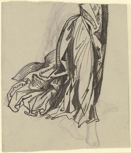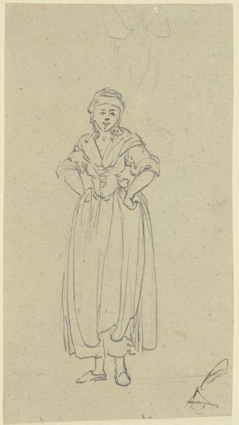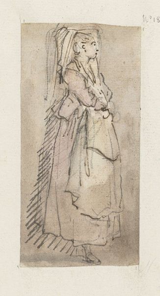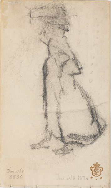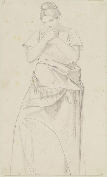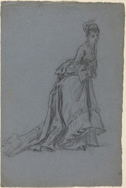 Philipp Rumpf made this sketch of a standing woman gathering her gown, sometime in the 19th century. During the 1800s, fashion became an important marker of social standing. The elaborate dresses of the era, with their layers of fabric and restrictive corsets, visually communicated wealth and status. But they also physically constrained women, limiting their movement and reinforcing traditional gender roles. In this sketch, the woman’s gesture of gathering her gown is interesting. Is she claiming some agency over her mobility, or merely adjusting to societal expectations? There is an emotional tension in this simple act. The sketch invites us to consider the complex negotiations women navigated during this era, between freedom, constraint, and self-expression. The act of 'gathering' could be interpreted as an attempt to balance these conflicting demands.