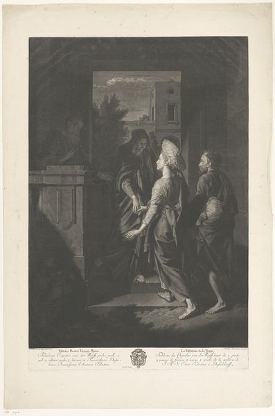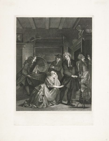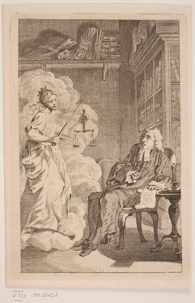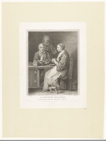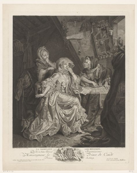 Editor: So, here we have L. Angélique Martinet's engraving, "H. Gregorius dicteert zijn preken," from 1770. It's a print, fairly detailed, showing Saint Gregory dictating his sermons. What I find fascinating is how much emphasis is placed on the physical process of creating religious texts. What catches your eye? Curator: Well, as a materialist, I am drawn to precisely that emphasis on process you noticed. Consider the labor embedded in each stage: the creation of paper, the mixing of ink, the engraving itself. Martinet is highlighting a chain of material production essential for disseminating religious ideology. How might the economics of printmaking at this time have influenced the circulation of ideas, both religious and secular? Editor: That’s a compelling point. It makes you think about how accessible or restricted the information might have been based on the cost and availability of printed material. Do you think Martinet is commenting on that directly? Curator: Perhaps not explicitly. However, by portraying the scene as one of skilled craft, she draws attention to the means by which the Church propagates its doctrines. The engraving technique itself becomes a metaphor for the standardization and mass production of belief. And let's consider Martinet's position within this system as a female engraver navigating a male-dominated field. What challenges do you think she might have faced in accessing materials and recognition? Editor: Wow, that’s something I hadn't considered. It changes how I see the piece, knowing it’s from the perspective of a woman in that industry. I was initially just focused on the religious aspect. Curator: Exactly. It's crucial to understand how art is produced, consumed, and valued within its specific historical context, and to always examine how power relations are encoded into the very materiality of art. Editor: I learned a lot, and I’ll never look at an engraving the same way again! Curator: Wonderful! The point is not to debunk the religious narrative, but rather to ground it in the material realities of its creation and distribution.