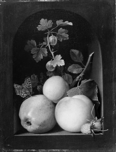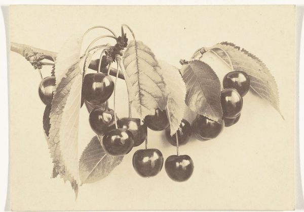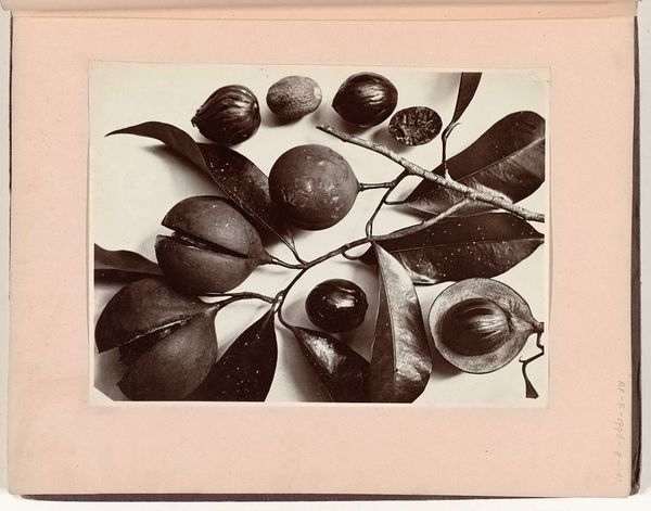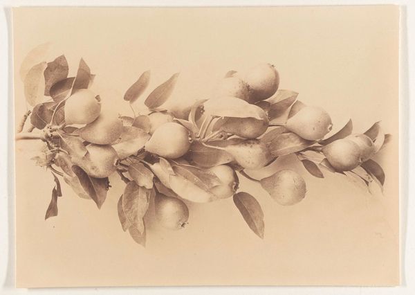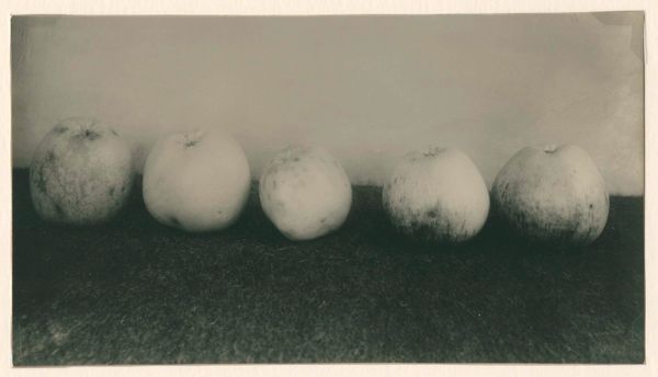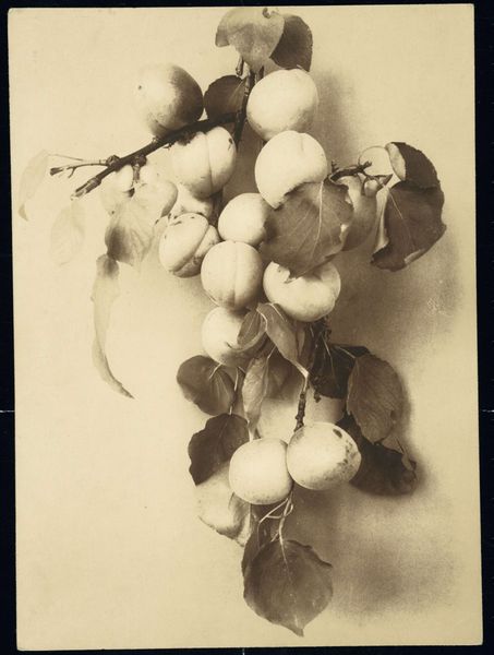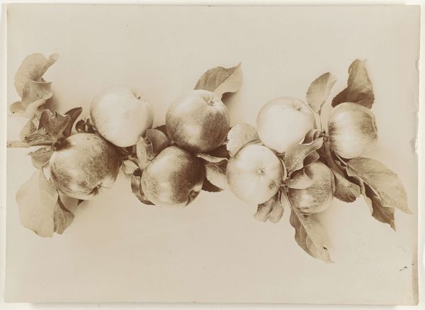 Editor: We're looking at a photograph called "Tak met appels," or "Branch with Apples," by Richard Tepe, sometime between 1900 and 1930. The muted tones give it such a dreamy quality, almost like a memory. It's beautifully composed. I wonder, what draws your eye when you look at this image? Curator: It whispers to me of simpler times. Imagine picking those apples straight from the tree. Notice how the light caresses the fruit, highlighting their gentle curves, but then consider that perhaps it's not just about prettiness. The leaves, some perhaps decaying or nibbled on... could these details reflect something about time and transience? Do you see it? Editor: I think I see what you mean... like a visual memento mori? The perfection of the fruit is juxtaposed with the decaying leaves. Curator: Exactly. Photography in those days wasn't just snapping a picture; it was carefully constructing a scene, a narrative. These elements – the light, the apples, the slightly withered leaves – create a mood, an atmosphere. A fleeting, gorgeous moment suspended in time. Makes you wonder about what Tepe wanted to say, doesn't it? It invites our reflection and imagination. Editor: It definitely makes you appreciate the beauty in the everyday, and that nothing lasts forever, even perfectly round apples. Curator: Yes, and artfully composed to encourage such reflections. Beautiful and poignant at the same time! I’ll never look at an apple the same way again. Editor: Me neither. Thanks for sharing that perspective!
